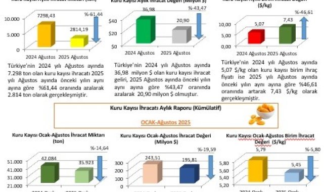 Türkiye'nin kuru kayısı üretiminin büyük bölümünü karşılayan Malatya'da, 2025 yılı Ağustos ayı ile Ocak-Ağustos dönemini kapsayan dış ticaret verileri açıklandı. Rapora göre, Ağustos ayında ihracat miktarında ciddi bir düşüş yaşanırken, birim fiyatlarda artış gözlendi.Malatya Ticaret Borsası tarafından açıklanan dış ticaret raporuna göre, Ağustos ayında kuru kayısı ihracatı geçen yılın aynı ayına göre yüzde 61 oranında azalarak 2 bin 800 tona geriledi. Aynı dönemde birim ihracat fiyatı yaklaşık 2,5 dolar artarak 7,43 dolara yükseldi. Ancak ihracat miktarındaki düşüş nedeniyle 2024 yılı Ağustos ayında 37 milyon dolar olan gelir, 2025 yılı Ağustos ayında 21 milyon dolara düştü.Raporda, 2025 yılı Ocak-Ağustos dönemine ilişkin veriler de paylaşıldı. Bu dönemde kuru kayısı ihracatı geçen yılın aynı dönemine göre 6 bin ton azalarak 36 bin ton olarak gerçekleşti. Ortalama birim fiyat ise geçen yılın aynı dönemine göre yaklaşık 0,35 dolar düşerek 5,45 dolar oldu. Bu gelişmelerin sonucunda, 2024 yılının ilk sekiz ayında 243 milyon dolar olan toplam ihracat geliri, 2025 yılı aynı döneminde yüzde 20 azalarak 196 milyon dolara geriledi.Yetkililer, 11-12 Nisan 2025 tarihlerinde Türkiye genelinde yaşanan zirai don olayının kayısı üretiminde yüzde 100'e yakın ürün kaybına yol açtığını, bu durumun da hem ihracat miktarının düşmesine hem de birim fiyatların 7,5 dolar seviyelerine çıkmasına neden olduğunu belirtti.