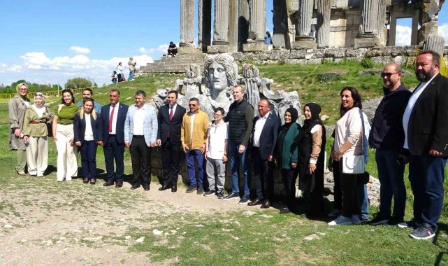 MHP Kütahya Milletvekili Ahmet Erbaş ve MHP Kocaeli Milletvekili Saffet Sancaklı, Kütahya'nın Çavdarhisar ilçesinde bulunan Aizanoi Antik Kenti'ni ziyaret etti. Milletvekilleri, antik kentin her geçen yıl artan ziyaretçi sayısına dikkat çekti.MHP Kütahya Milletvekili Ahmet Erbaş, Aizanoi'nin son yıllarda büyük bir ivme kazandığını vurgulayarak, "Her gelişimde burayla biraz daha gurur duyuyorum, biraz daha heyecanlanıyorum. Yaklaşık 10 yıl önce 3 bin ile 5 bin arasında olan ziyaretçi sayısı, 2024 yılında 100 bine ulaştı. 2025'te bu sayının 150 bin ila 200 bin olması bekleniyor" dedi.Erbaş, bu başarıda emeği geçen Kültür ve Turizm Bakanlığı'na, Dumlupınar Üniversitesi'ndeki akademisyenlere ve yerel yöneticilere teşekkür etti. Aizanoi'nin uluslararası alanda da dikkat çektiğini belirten Erbaş, "Sadece geçen yıl burası 7 kez uluslararası haberlere konu oldu. Efes ile eşdeğer bir antik kentten söz ediyoruz. Şu an görünen yapı, bu büyük alanın yalnızca yüzde 10-15'ini oluşturuyor" ifadelerini kullandı.İlk kez Çavdarhisar Aizanoi Antik Kenti'ni ziyaret eden MHP Kocaeli Milletvekili Saffet Sancaklı ise antik kentten etkilendiğini belirterek, "Gerçekten etkileyici bir yer. Kütahya Milletvekilimiz Sayın Ahmet Erbaş da bu bölge için çok büyük bir şans. Kendisini tebrik ediyorum" dedi.Çavdarhisar Belediye Başkanı Halil İbrahim Topbaş, Aizanoi'nin tarihi ve turistik potansiyeline dikkat çekerek, "İlçemiz Kütahya'nın kuzeyinde, şehir merkezine 50 kilometre uzaklıkta. Dünyanın en iyi korunmuş tapınaklarından biri, bir tiyatro ve tarihin ilk ticaret merkezlerinden biri burada yer alıyor" açıklamasında bulundu.Topbaş, belediye olarak kazılara verdikleri destekten ve yeni projelerden de söz ederek, "Karşılama merkezine bir kafe açmayı ve kaymakamlığımızca getirilen 10 Moğol çadırıyla kadınlara yönelik bir istihdam modeli oluşturmayı planlıyoruz" diye konuştu.