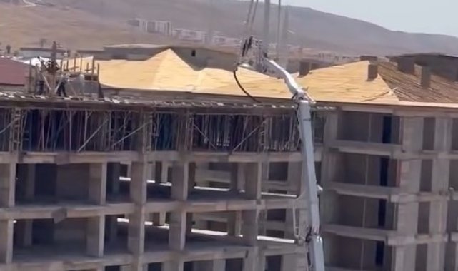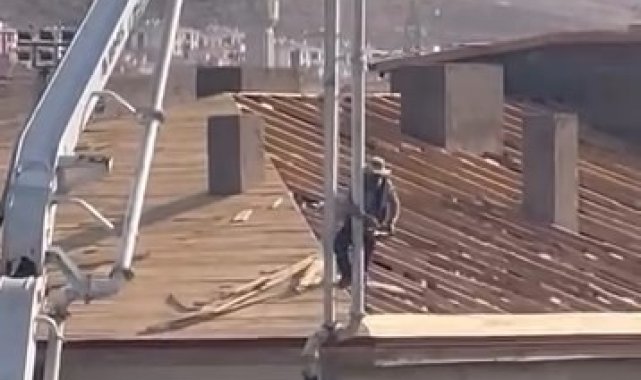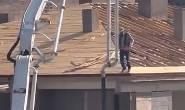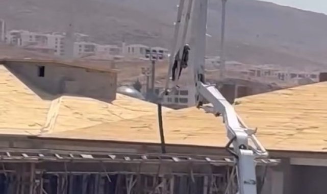 Elazığ'da beton pompasını adeta asansör gibi kullanan ve 6 katlı binanın üzerine çıkıp inen işçi, canını hiçe saydı. O anlar cep telefonu kamerasına yansıdı.Olay, merkez Abdullahpaşa Mahallesi'nde bulunan inşaat halindeki bir binada meydana geldi. Edinilen bilgiye göre, devam eden bir inşaata harç götüren firma, mikser ve pompa ile binaya beton atmaya başladı. Bu sırada ismi öğrenilmeyen bir işçi ise pompa hortumunu adeta asansör gibi kullandı. Çatının ucunda bekleyen işçi pompa hortumuna tutunarak aşağı indi. İşçi bir süre sonra yine aynı şekilde hortum üzerinde metrelerce yüksekliğe çıkarak başka bir binanın üzerine geçti. İşçi adeta canını hiçe sayarken, tehlikeli hareket, cep telefonu kamerasına yansıdı.