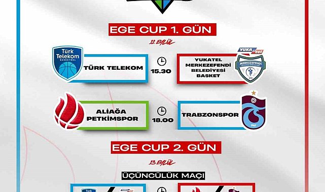 Aliağa Petkimspor'un ev sahipliğinde düzenlenecek olan Ege Cup, 11-13 Eylül tarihleri arasında düzenlenecek.Basketbol Süper Ligi ekiplerinden Aliağa Petkimspor'un her yıl geleneksel olarak düzenlediği Ege Cup, bu yıl 11-13 Eylül tarihleri arasında gerçekleşecek. Aliağa Belediyesi Spor Salonu'nda düzenlenecek Ege Cup 2025'e ev sahibi Petkimspor'un yanı sıra Merkezefendi Belediyesi Basket, Türk Telekom ve Trabzonspor katılacak.Basketbolseverlerin ücretsiz olarak izleyebileceği turnuvada, ilk gün maçları 11 Eylül Perşembe günü oynanacak. Günün ilk karşılaşmasında saat 15.30'da Türk Telekom ile Merkezefendi Belediyesi Basket karşı karşıya gelecek. Ardından saat 18.00'de Aliağa Petkimspor, Trabzonspor'la mücadele edecek.Turnuvanın ikinci gününde maç oynanmazken, 13 Eylül Cumartesi günü final ve üçüncülük karşılaşmaları yapılacak. İlk günün mağlup takımları saat 13.00'te üçüncülük mücadelesi, galip takımlar saat 15.30'da Ege Cup 2025 şampiyonluğu için karşı karşıya gelecek.