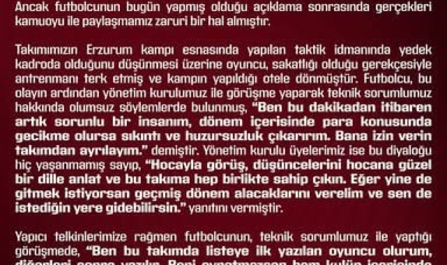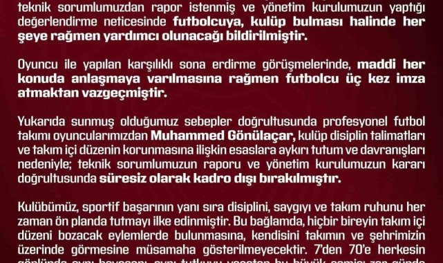 Elazığspor Kulübü, kadrodışı bırakılan futbolcusu Muhammed Gönülaçar hakkında bir açıklama yayımladı ve oyuncunun neden kadrodışı bırakıldığına açıklık getirdi.Nesine 2. Lig Beyaz Grup ekiplerinden Seza Çimento Elazığspor'da gündem Muhammed Gönülaçar. Erzurum kampında kadrodışı bırakılan ve bu akşam saatlerinde kişisel sosyal medya hesabından yayımladığı video ile kulüpte kalma isteğini dile getiren Muhammed Gönülaçar için Elazığspor bir açıklama yaparak neden kadro dışı bırakıldığını açıkladı. Bugüne kadar futbolcuya zarar vermemek adına açıklama yapılmadığı belirtilen metinde Elazığspor'un herkesten üstün olduğu belirtildi.Açıklamada, "Oyuncu ile yapılan karşılıklı sona erdirme görüşmelerinde, maddi her konuda anlaşmaya varılmasına rağmen futbolcu üç kez imza atmaktan vazgeçmiştir. Sunmuş olduğumuz sebepler doğrultusunda profesyonel futbol takımı oyuncularımızdan Muhammed Gönülaçar, kulüp disiplin talimatları ve takım içi düzenin korunmasına ilişkin esaslara aykırı tutum ve davranışları nedeniyle; teknik sorumlumuzun raporu ve yönetim kurulumuzun kararı doğrultusunda süresiz olarak kadro dışı bırakılmıştır. Kulübümüz, sportif başarının yanı sıra disiplini, saygıyı ve takım ruhunu her zaman ön planda tutmayı ilke edinmiştir. Bu bağlamda, hiçbir bireyin takım içi düzeni bozacak eylemlerde bulunmasına, kendisini takımın ve şehrimizin üzerinde görmesine müsamaha gösterilmeyecektir. 7'den 70'e herkesin gönlünde aynı heyecanı, aynı tutkuyu yaşatan bu büyük camia; zor günde kenetlenen, sevinçte coşan, hüzünde tek yürek olan bir şehrin simgesidir. Elazığspor, yalnızca sahada değil, her evde, her sokakta, her yürekte var olan koca bir sevdadır. Bu büyüklüğü anlamayanlar bilsin ki; Elazığ'da herkesin ortak paydası Elazığspor'dur" ifadelerine yer verildi.