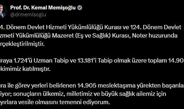 Sağlık Bakanı Kemal Memişoğlu, 124. Dönem Devlet Hizmeti Yükümlülüğü Kurası ve 124. Dönem Devlet Hizmeti Yükümlülüğü Mazeret (Eş ve Sağlık) Kurası'nın gerçekleştiğini duyurdu.Sağlık Bakanı Kemal Memişoğlu sosyal medya hesabından yaptığı paylaşımda, 124. Dönem Devlet Hizmeti Yükümlülüğü Kurası ve 124. Dönem Devlet Hizmeti Yükümlülüğü Mazeret (Eş ve Sağlık) Kurası'nın noter huzurunda gerçekleştirildiğini duyurdu. Bakan Memişoğlu paylaşımında, şu ifadelere yer verdi:"Kuraya bin 724'ü Uzman Tabip ve 13 bin 181'i Tabip olmak üzere toplam 14 bin 905 hekimimiz katılmıştır. Kura ile görev yerleri belirlenen 14 bin 905 meslektaşıma yürekten başarılar diliyor; sonuçların ülkemiz, milletimiz ve büyük sağlık ailemiz için hayırlara vesile olmasını temenni ediyorum."