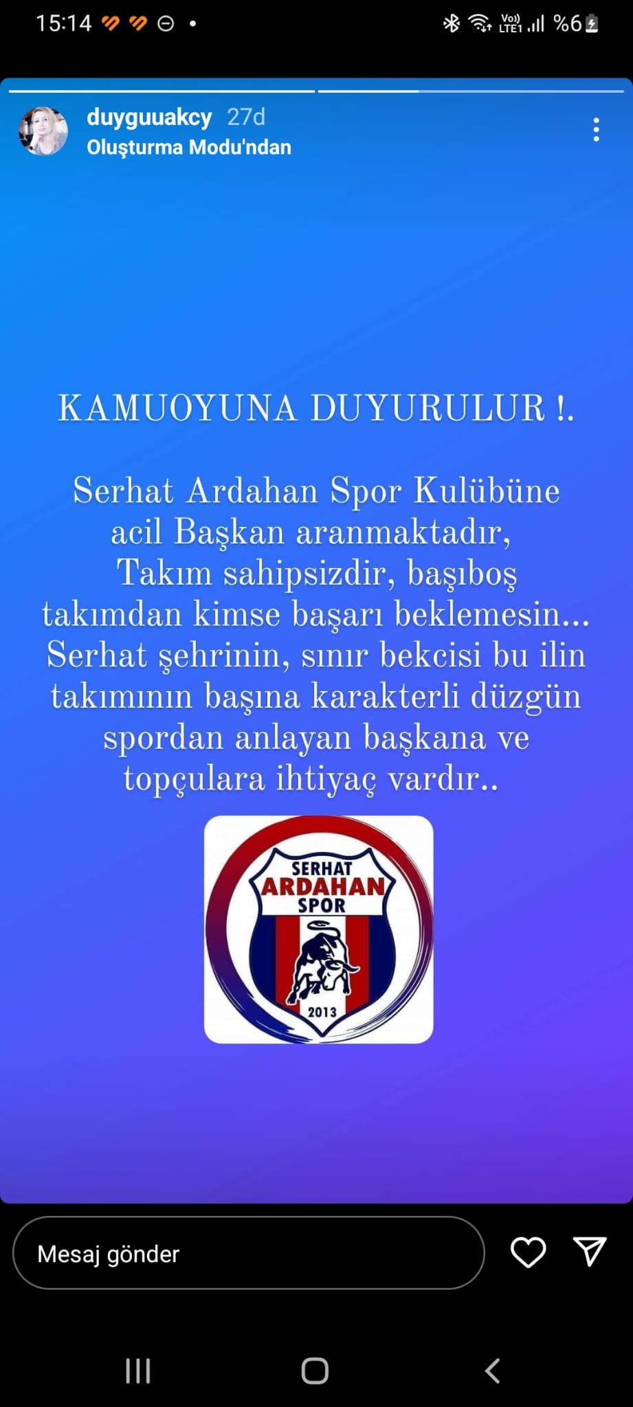 Serhat Ardahanspor'da göreve geldiği günden beri hizmet eden ve hiç bir çıkar düşünmeden varını yoğunu ortaya koyan Kulüp Başkanı Murat Gökdemir'i hiçe sayarak Kulüp Başkanı aranıyor diyerek paylaşım yapan Yönetici Duygu Akçay görevden alındı. Acil Başkan AranmaktadırYaptığı paylaşımda, "başıboş takımdan kimse birşey beklemesin" diyen Akçay, " Kamuoyuna Duyurulur! Serhat Ardahan Spor Kulübüne acil Başkan aranmaktadır, Takım sahipsizdir, başıboş takımdan kimse birşey beklemesin... Serhat şehrinin sınır bekçisi bu ilin takımının başına karakterli düzgün spordan anlayan başkana ve topçulara ihtiyaç vardır" paylaşımı yaptı. Paylaşımı haberleştiren Şenol Kırman'ı ise ağır topa tuttu ve "başkan aranıyor" paylaşımını kaldırdı. Yapmam Gereken Tek Şey Var Gereğimi Yapmak