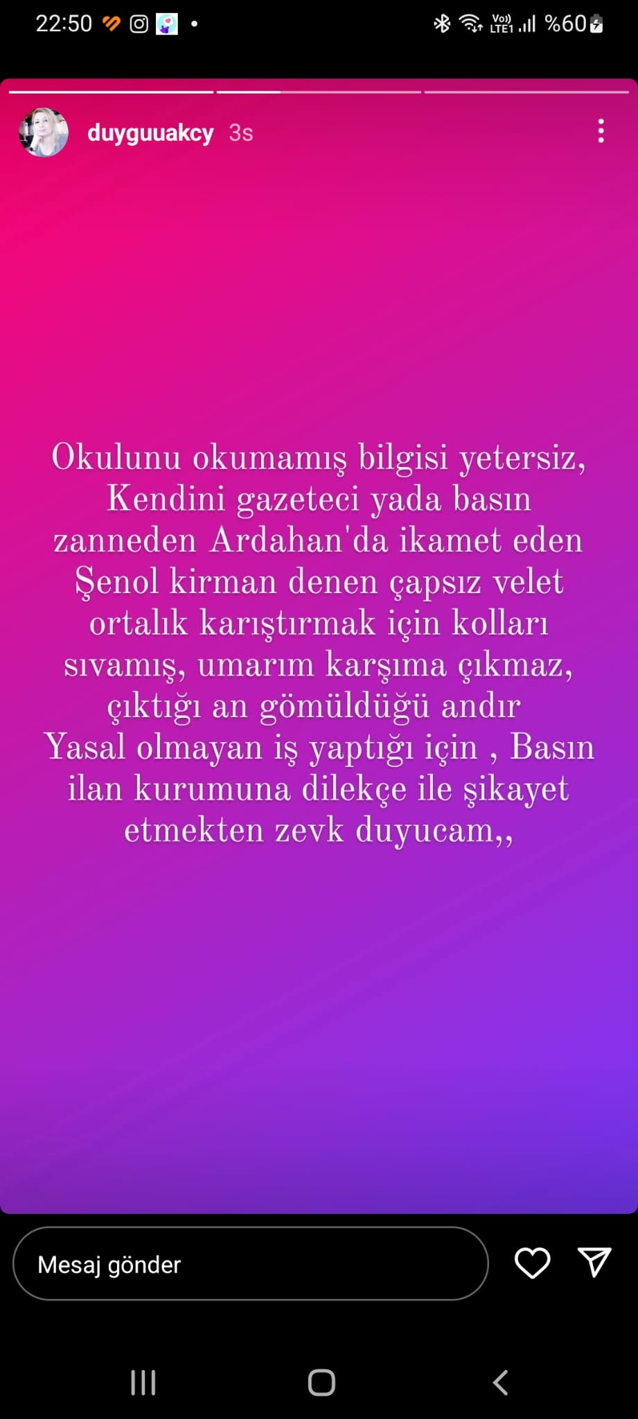 T4Haber olarak, Gazeteci Şenol Kırman'a, "okulunu okumamış, bilgisi yetersiz, kendini gazeteci yada basın zanneden Ardahan'da ikamet eden Şenol Kırman denen çapsız velet" diye aşağılayan Akçay'ın basın ilan kurumuna kayıtlı bir gazeteciyi bu denle aşağılamasını kınıyor. Ardahan'ın değerli savcılarını göreve davet ediyoruz.Haber: Güven Gök