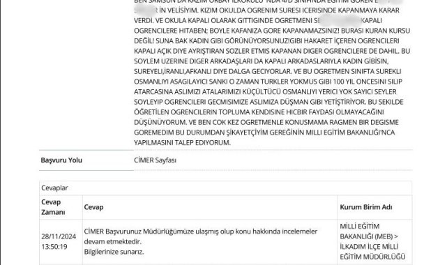 Samsun'da bir veli, kızının başörtüsü taktığı gerekçesiyle sınıf öğretmeni tarafından 'mobbing' ve 'ayrımcılığa' maruz kaldığını iddia ederek, CİMER'e şikayette bulundu. Olay sonrası öğretmen ve veli arasında okulda yaşanan tartışma darp iddialarıyla karakola taşındı.Olay, İlkadım ilçesinde bulunan Kazım Orbay İlkokulu'nda meydana geldi. Elif Özdemir Söyler isimli veli, 4. sınıf öğrencisi kızı E.A. Söyler'in başörtüsü takmasından dolayı sınıf öğretmeni S.Y. tarafından ayrımcı tutumlara maruz kaldığını öne sürdü. Veli, öğretmen hakkında birçok kez CİMER'e şikayet dilekçesi gönderdi."Kadın gibi görünüyorsunuz" sözleri iddiaya girdiElif Özdemir Söyler, 28 Ekim 2024 tarihli şikayet dilekçesinde, "Kızım okulda öğrenim süresi içinde kapanmaya karar verdi. Okula başörtülü gittiğinde öğretmeni S.Y., 'Böyle kafanıza göre kapanamazsınız! Burası Kur'an kursu değil! Şuna bak kadın gibi görünüyorsunuz!' şeklinde ifadeler kullandı. Diğer öğrenciler de bu sözlerden etkilenerek, başörtülü arkadaşlarına 'kadın gibisin', 'Suriyeli', 'Afganlı' gibi söylemlerle alay etmeye başladı" iddiasında bulundu.Darp iddialarıyla karakolluk oldularSamsun İl Milli Eğitim Müdürlüğü tarafından başlatılan idari soruşturma devam ederken, 15 Nisan 2025'te veli ve öğretmen okulda karşı karşıya geldi. Yaşanan gerginliğin ardından iki taraf da birbirlerinden 'darp' suçlamasıyla şikayetçi oldu.Veli Elif Özdemir Söyler, karakolda verdiği ifadede öğretmenin kendisini iteklediğini ve çıkan arbedede yüzünde çizik ve kızarıklık oluştuğunu belirtirken, "Ben ona vurmadım, o da bana vurmadı. Tehdit veya hakaret de olmadı" diye konuştu.Öğrenciden ayrımcılık iddiasıÖğrenci E.A. Söyler de ifadesinde öğretmeninin kendilerine, "Burası imam hatip mi? Kapanamazsınız" dediğini belirterek, "Sınıfta parmak kaldırdım ama bana söz hakkı vermedi. Sonra başka arkadaşım parmak kaldırınca ona verdi. Bu ayrımın başörtümden dolayı olduğunu düşünüyorum" dedi. Öğrenci ayrıca, CİMER'e yapılan şikayet sonrası gelen müfettişler ile ilgili olarak öğretmenin kapalı öğrencilerle baskı kurmaya çalıştığını iddia etti.Sendikalardan eylem, veliden tepkiOlay sonrası bazı sendikalar okul önünde 'öğretmene darp' iddiasıyla eylem düzenlerken, veli Elif Özdemir Söyler de açıklamada bulundu. Söyler, "Bu başörtüsü düşmanlığı hala ülkemizde yaşanıyor. Biz müslüman bir ülke olarak bu hakaretlere maruz kalmak istemiyoruz. Herkes inancını özgürce yaşayabilmeli. Öğretmenin ceza almasını ve eğitimine bu şekilde devam etmemesini istiyorum" ifadelerini kullandı.İl Milli Eğitim Müdürlüğü, başörtüsü konusundaki şikayet üzerine başlatılan idari soruşturmanın sürdüğünü açıkladı.