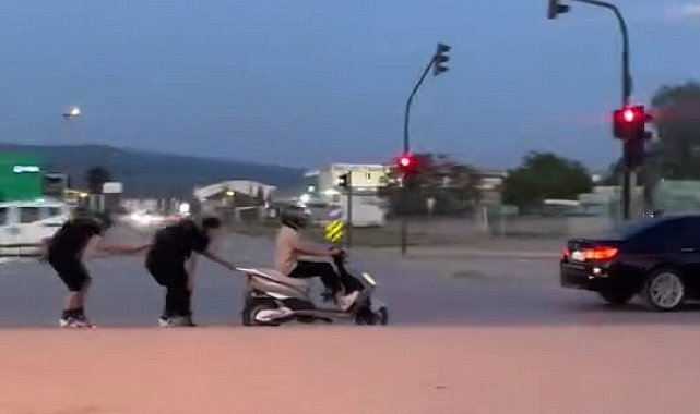 Bursa'nın İnegöl ilçesinde trafikte bir motosikletin arkasına tutunarak yolculuk yapan patenli gençler tehlikeye davetiye çıkardı.İnegöl-Alanyurt yolu üzerinde 3 patenli genç, hareket halindeki bir motosikletin arkasına tutunarak yolculuk etti. O anlar çevredeki vatandaşlar tarafından cep telefonu kamerasıyla kaydedildi. Yoğun araç trafiğinin olduğu yolda gençlerin bu sorumsuz davranışı, hem kendi canlarını hem de diğer sürücülerin güvenliğini tehlikeye attı. Sosyal medyada kısa sürede yayılan görüntüler büyük tepki topladı.